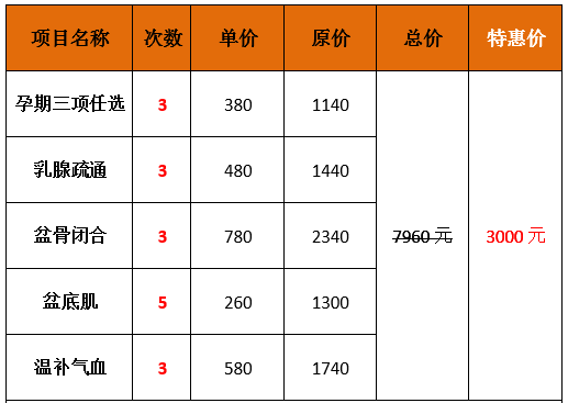 (产后项目:温补气血580元、头部助眠380元、关节疼痛580元、子宫保养380元、乳腺疏通480元、排残乳480元、腹直肌分离380元。)